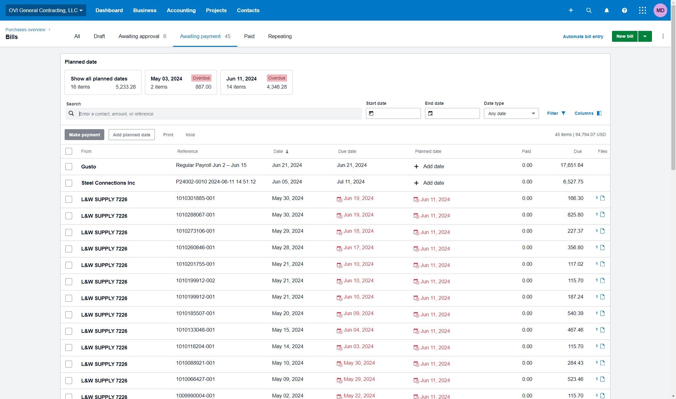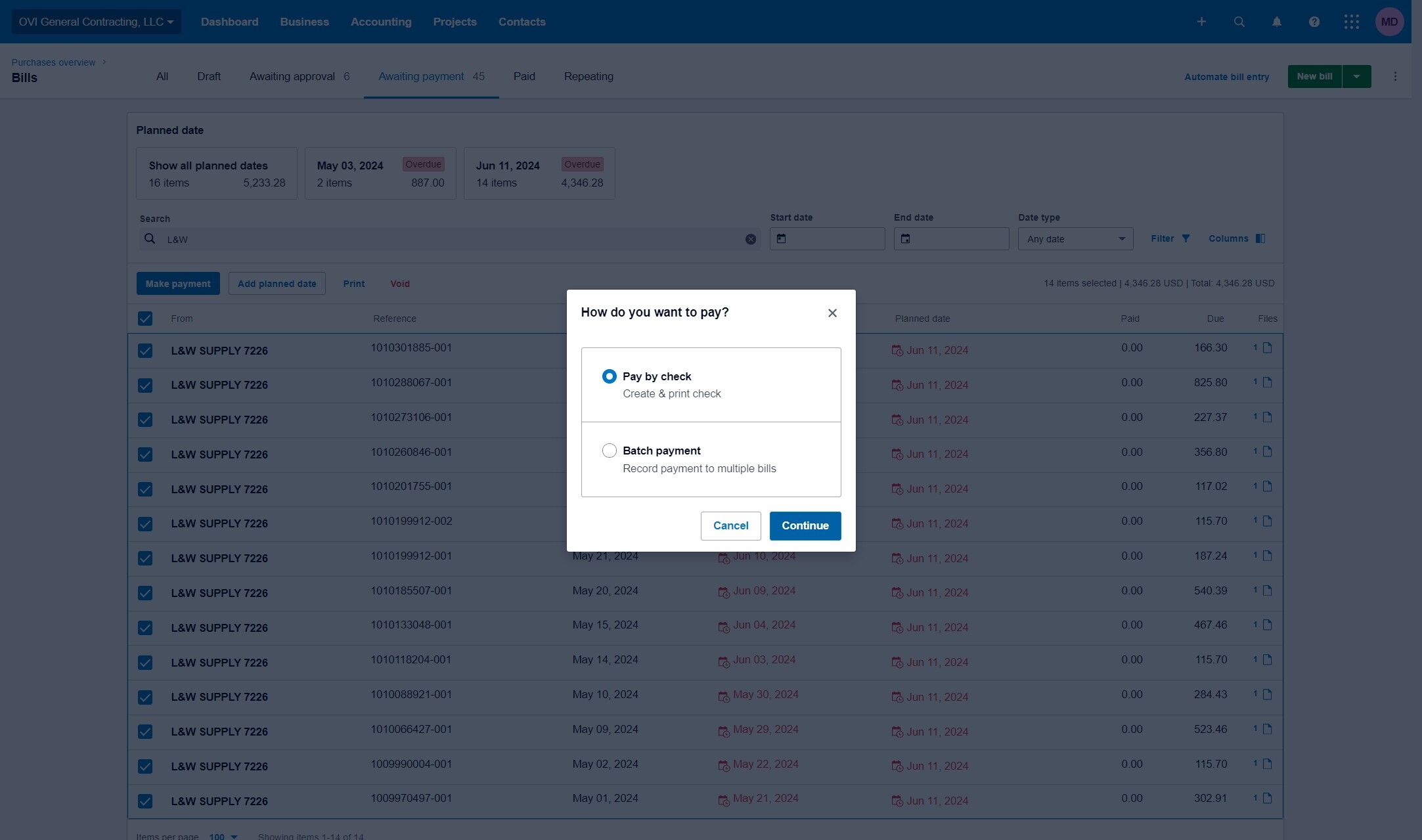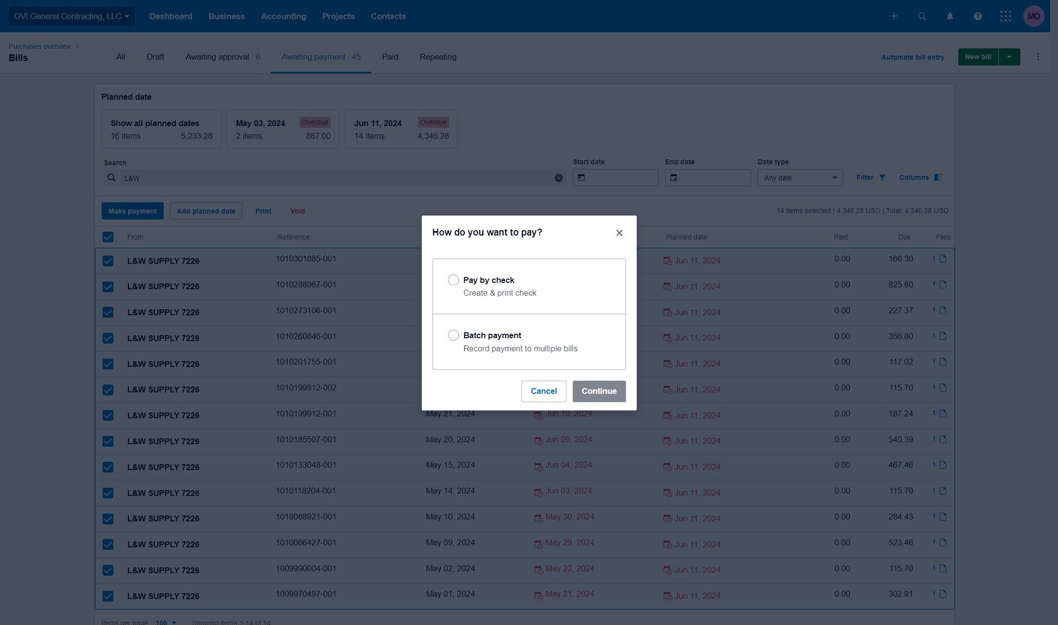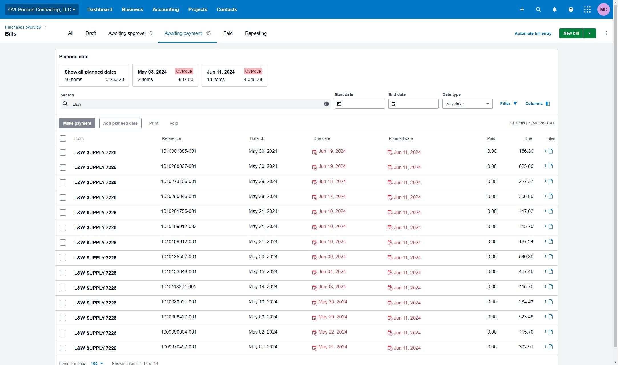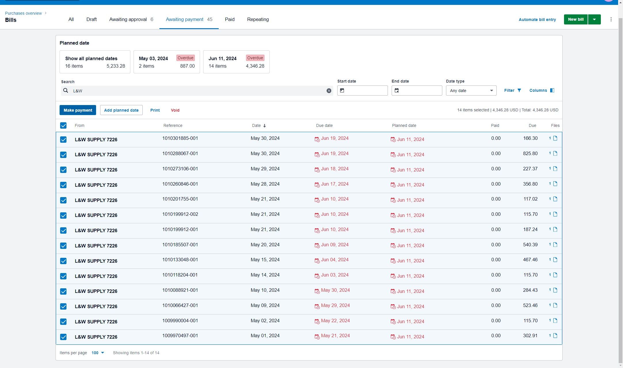 In the search box, type the name of the service provider or supplier to locate the corresponding bill. For example, enter "L&W" and press Enter.