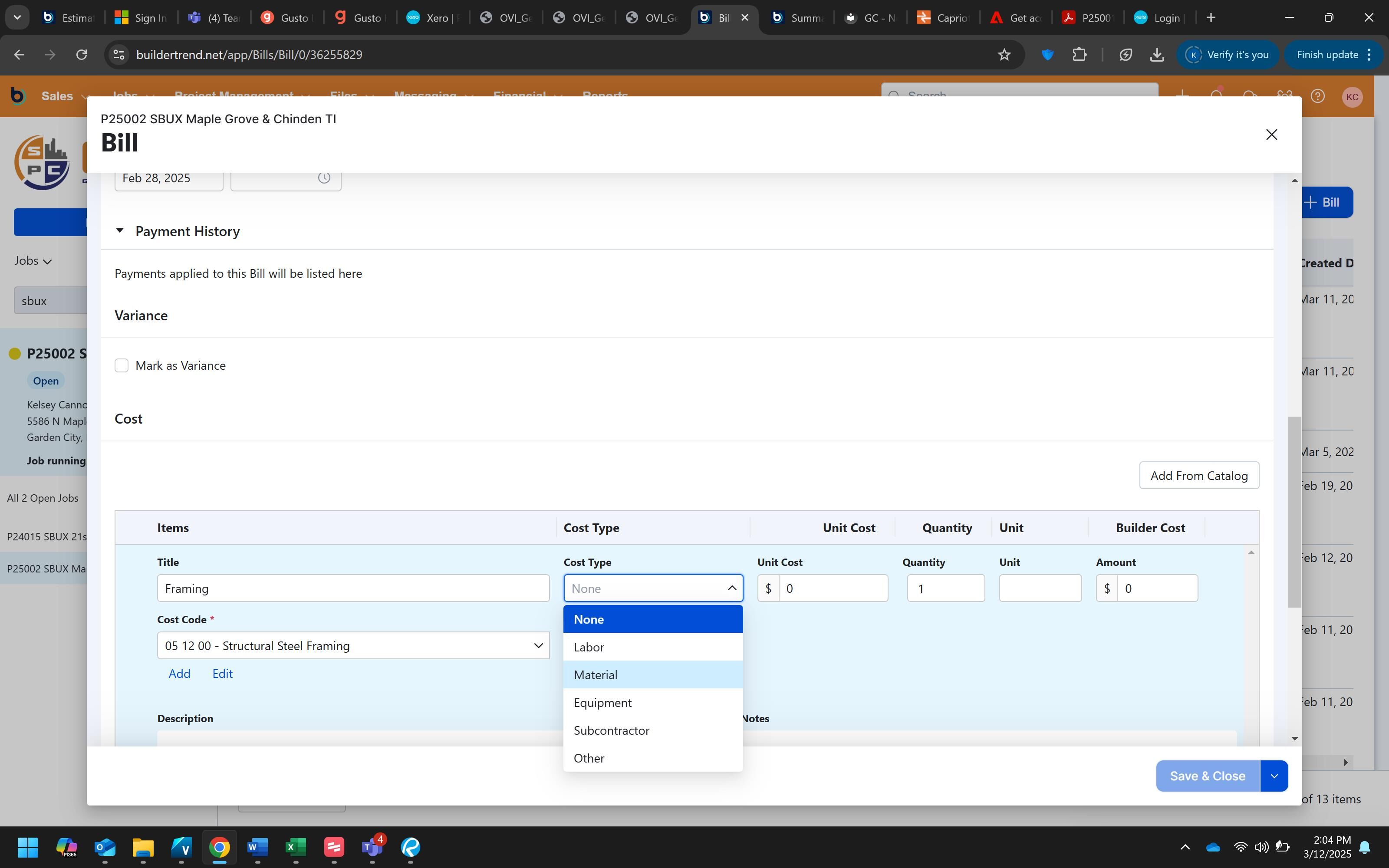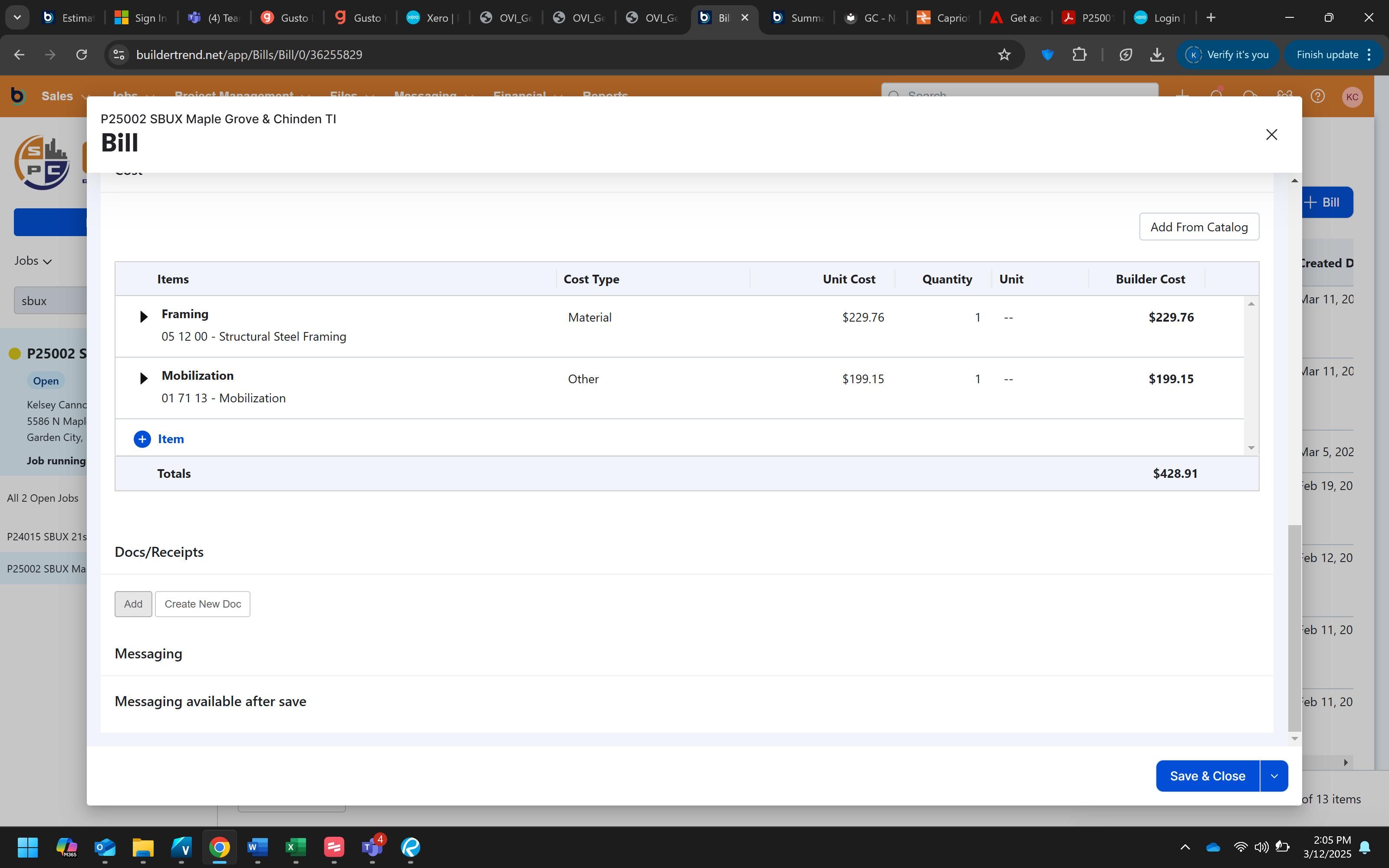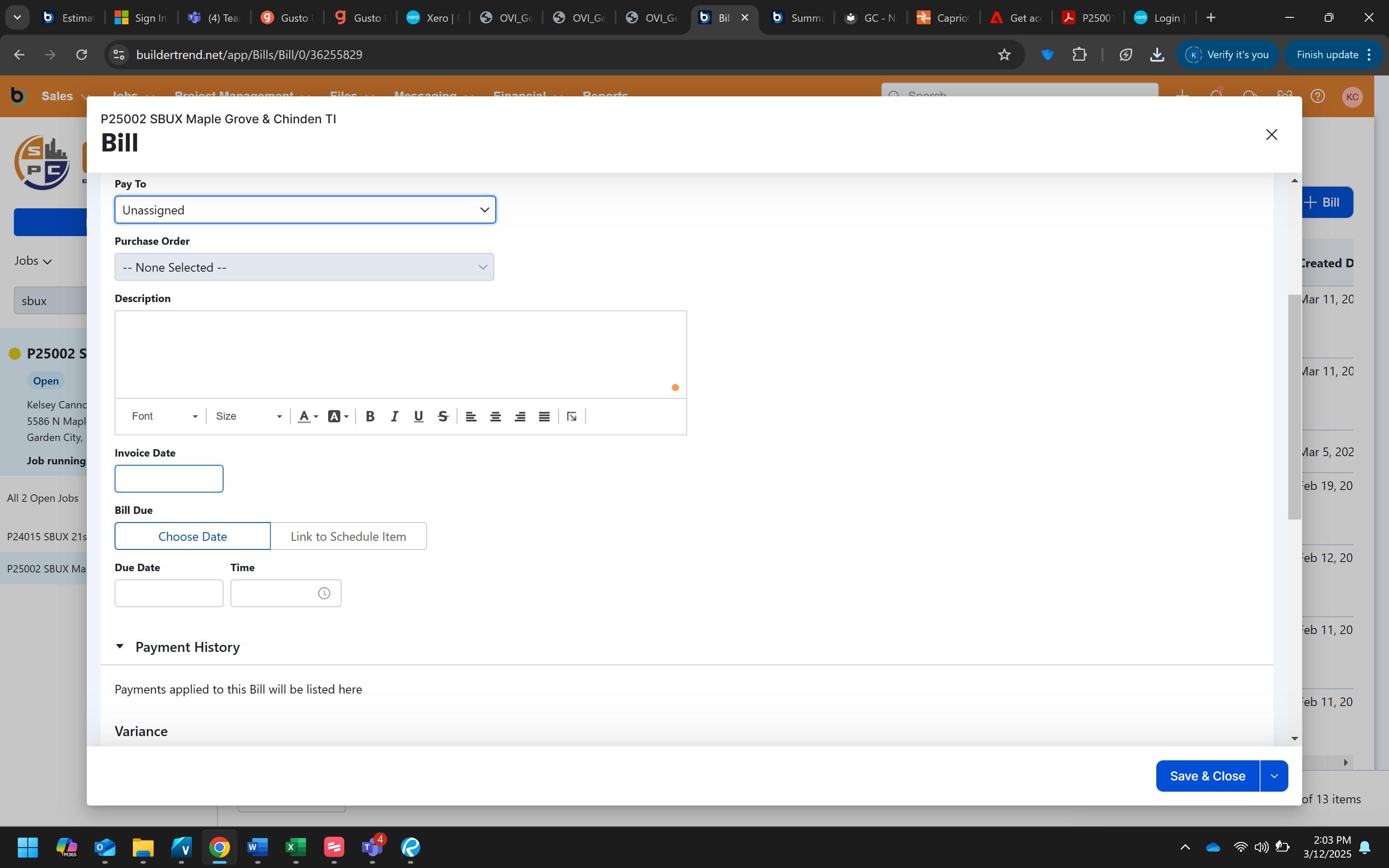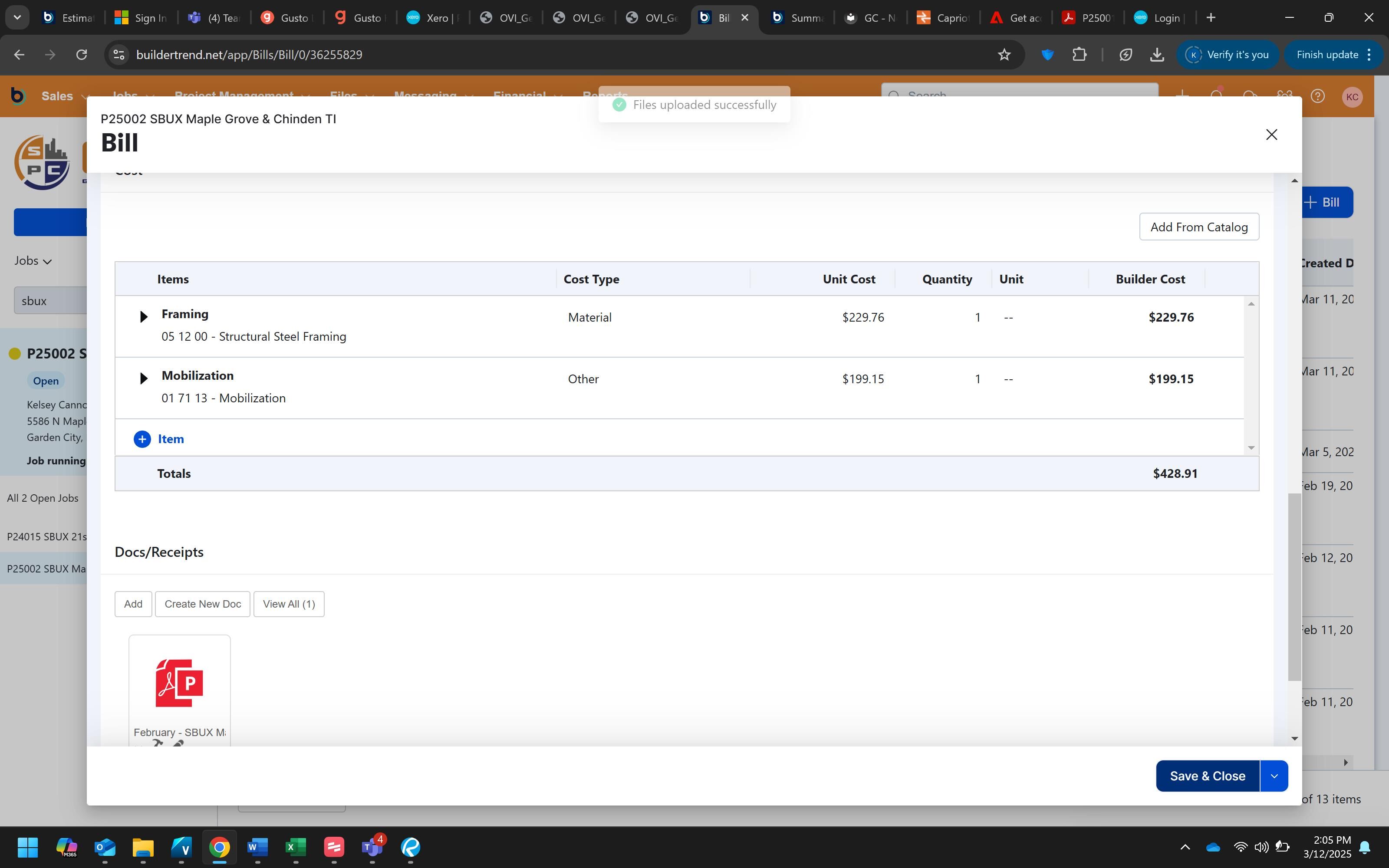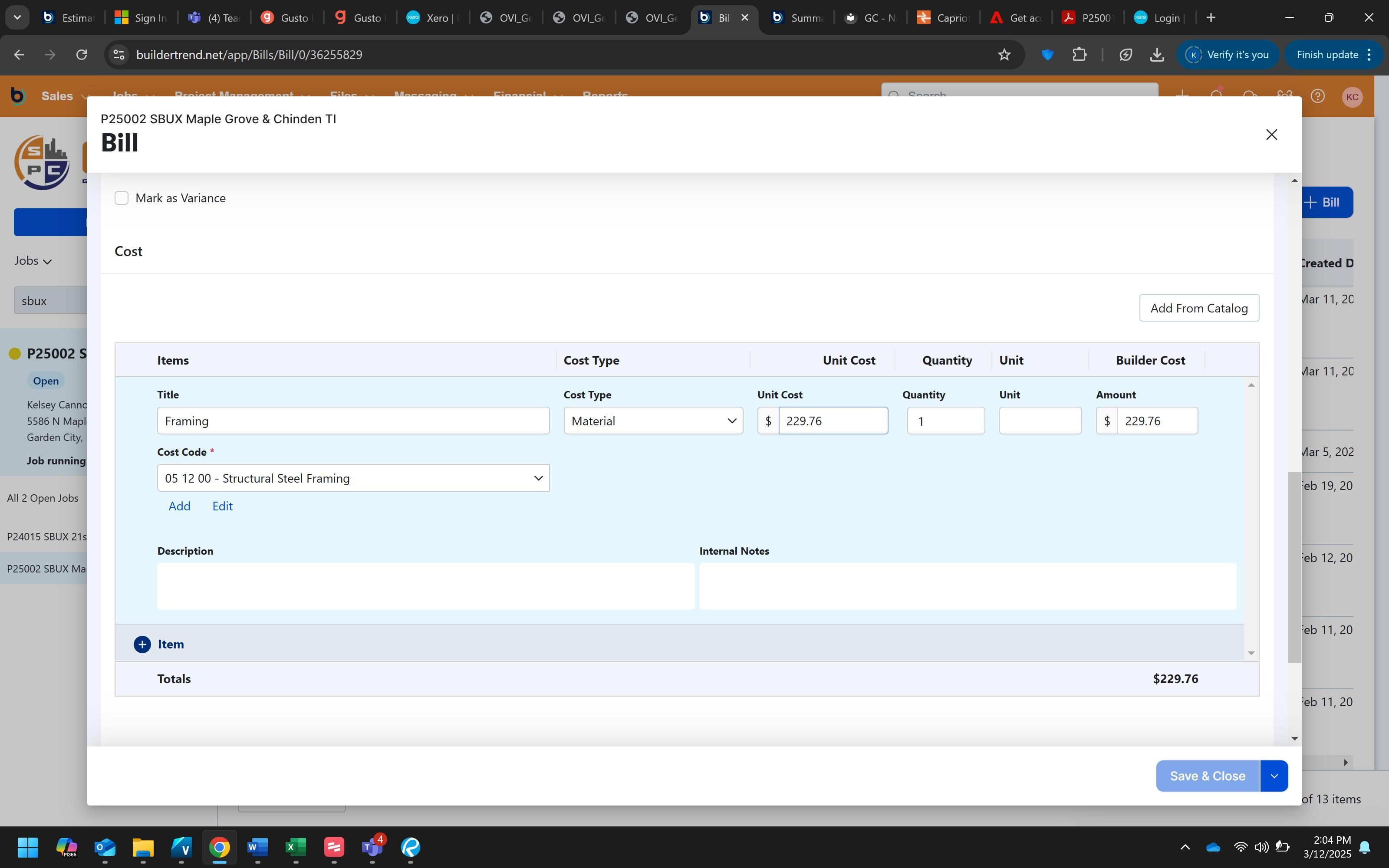 Click "Save & Close" to complete the process and save the bill to the project.
