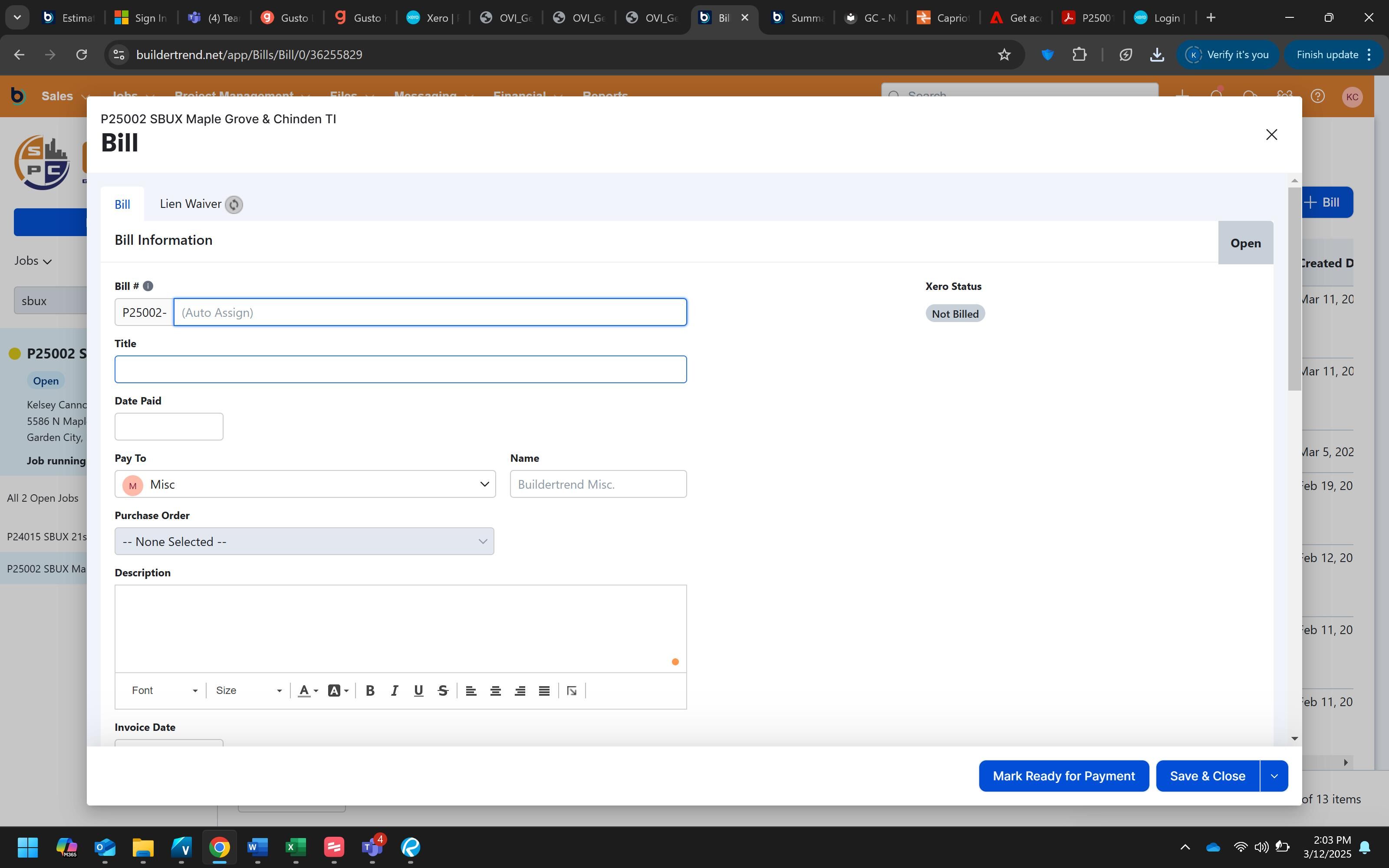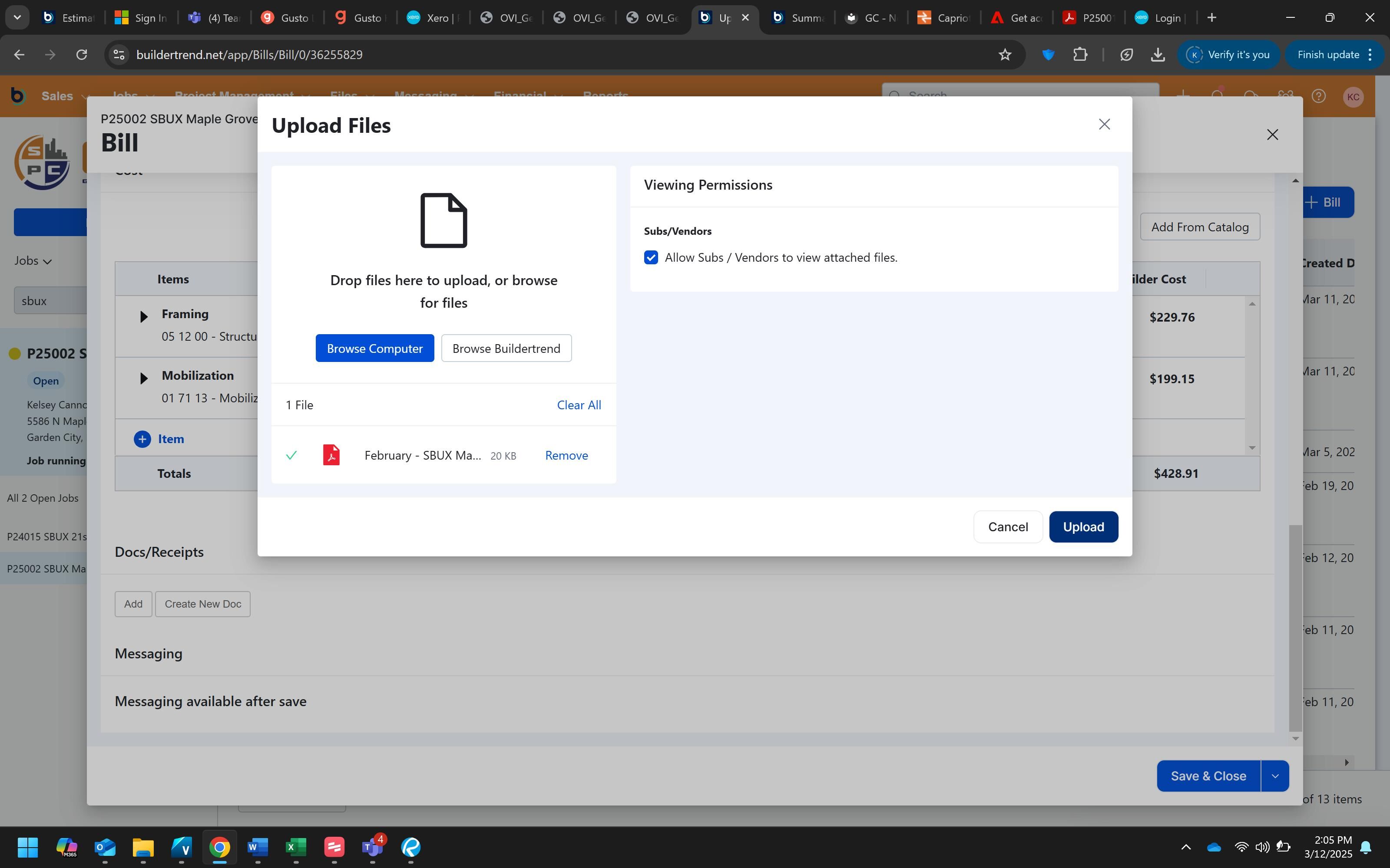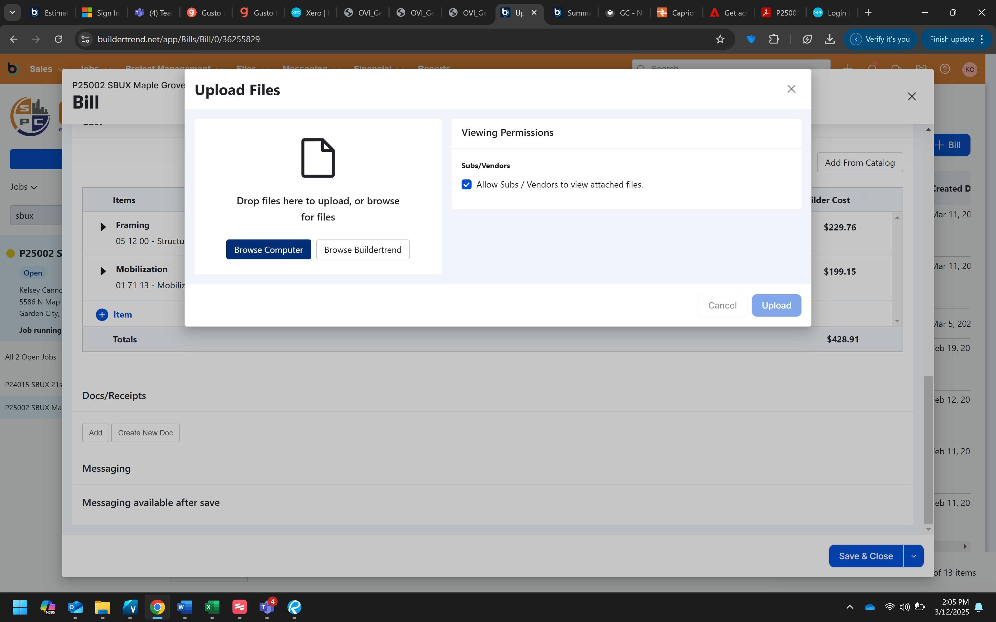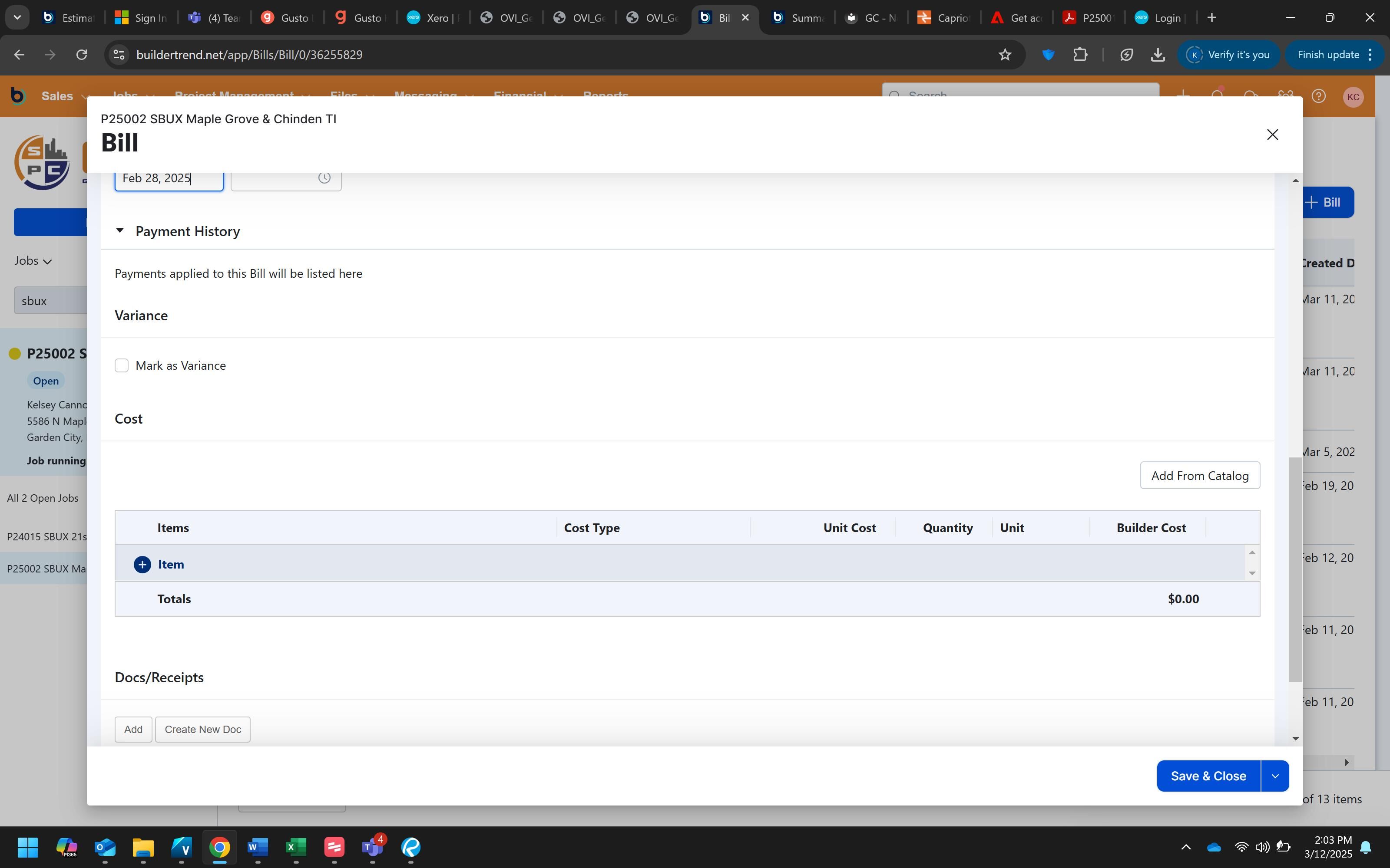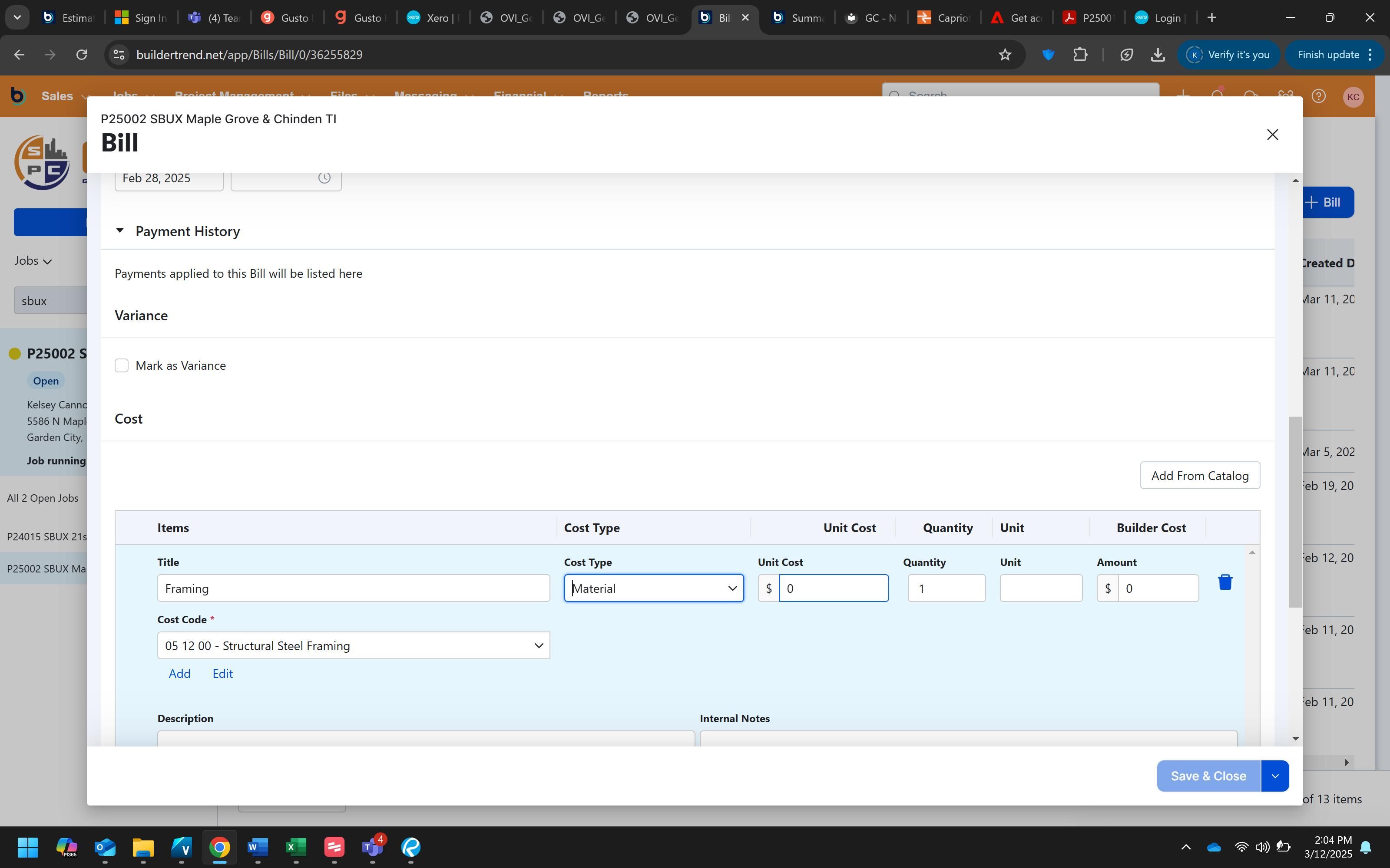 Click "Save & Close" to complete the process and save the bill to the project.