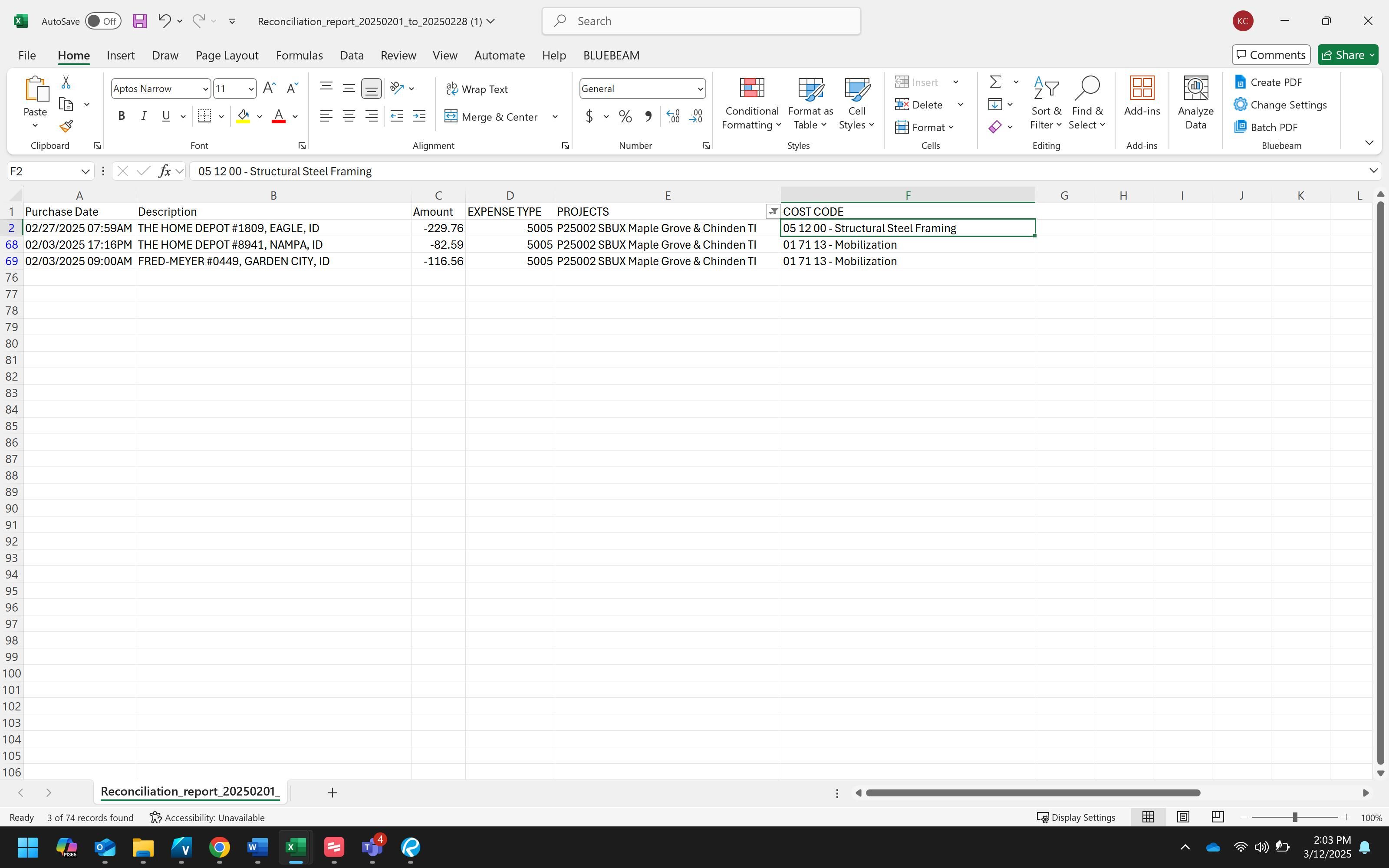 Review the Excel spreadsheet to identify the appropriate cost code category. In this example, the first cost code is for framing.