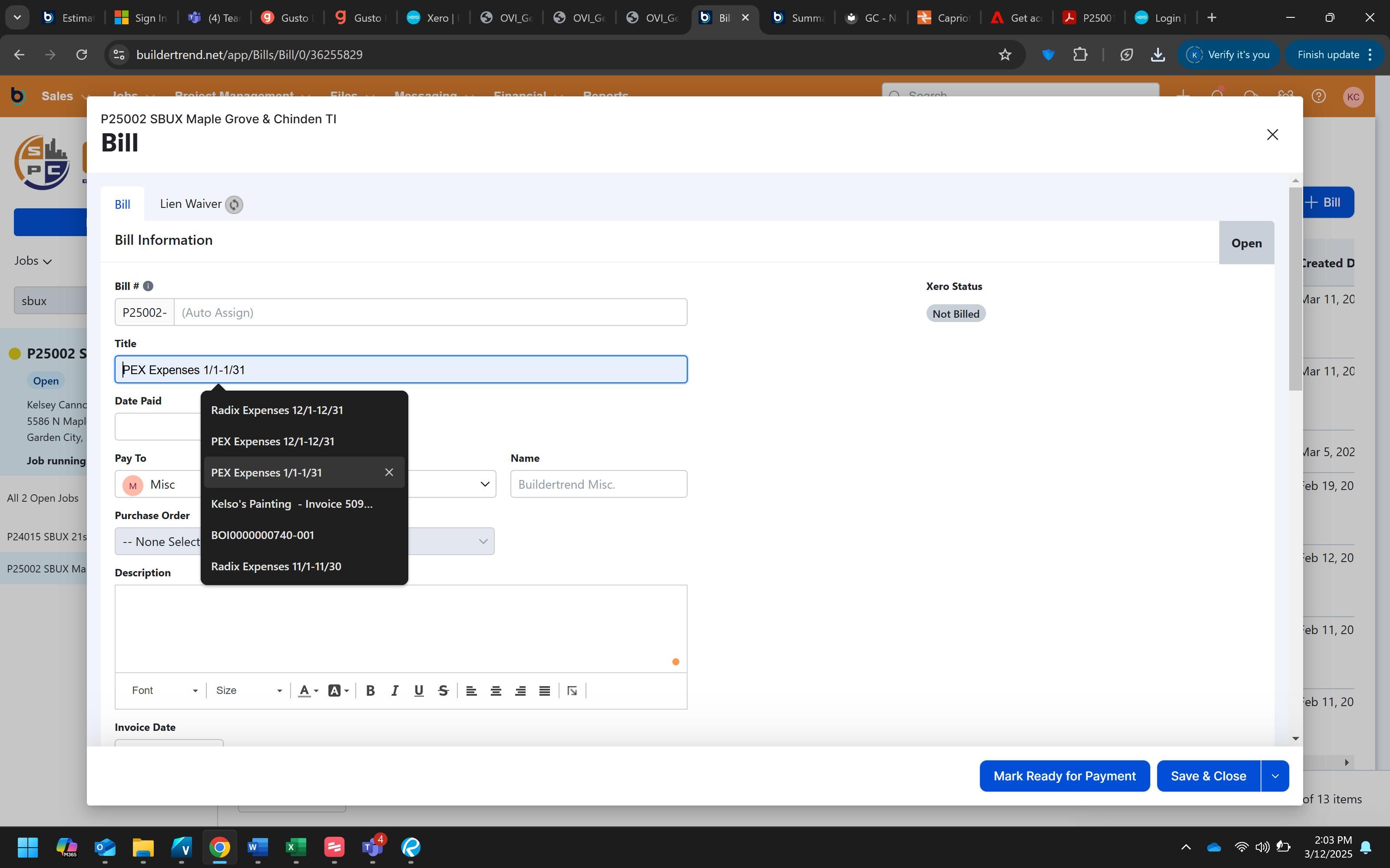 - Created a new bill with proper title format (PEX Expenses - MM/DD-MM/DD)