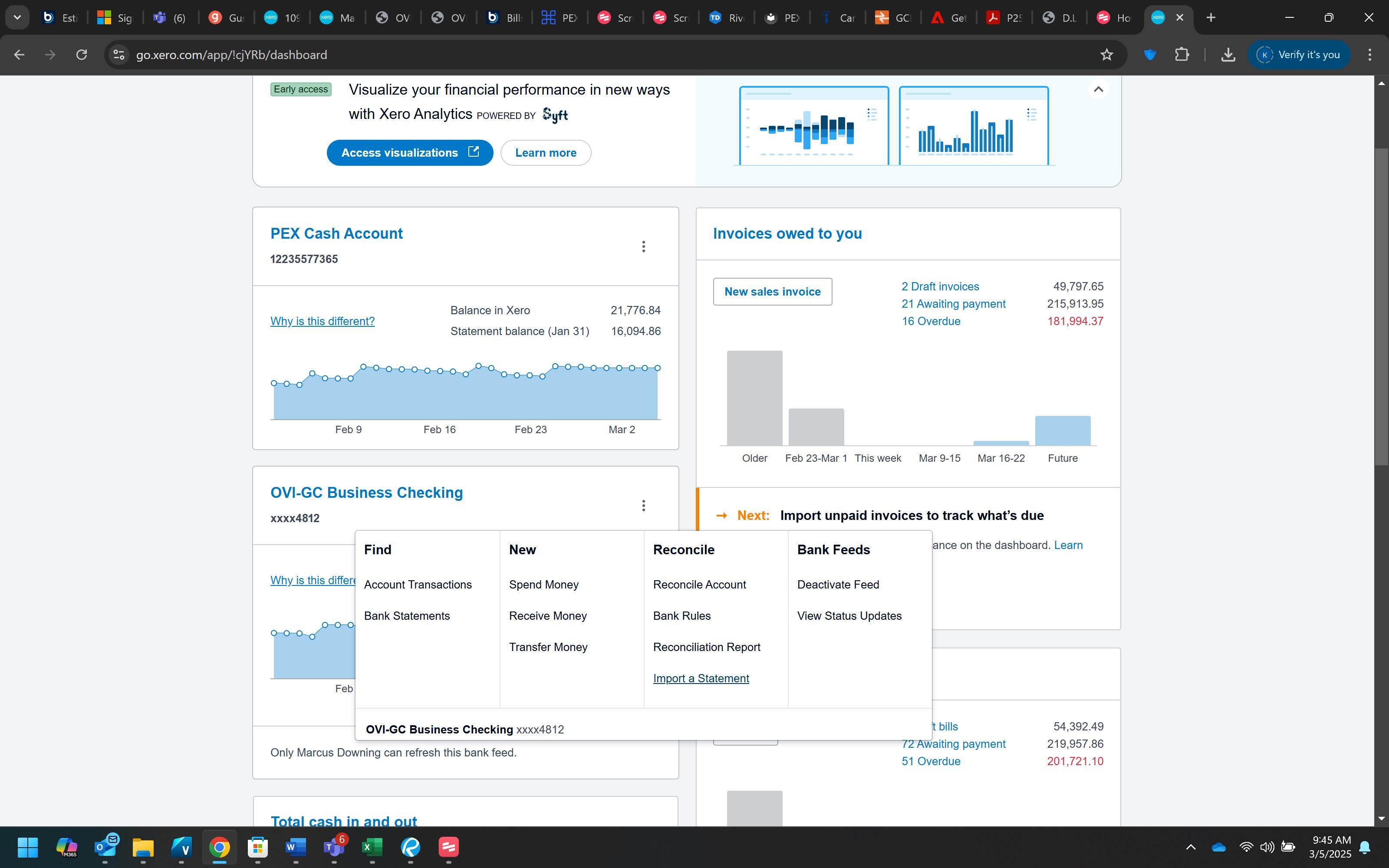 Login to Xero, locate the OVI-GC Business checking account on the dashboard and click on the 3 stacked dots to the right.
