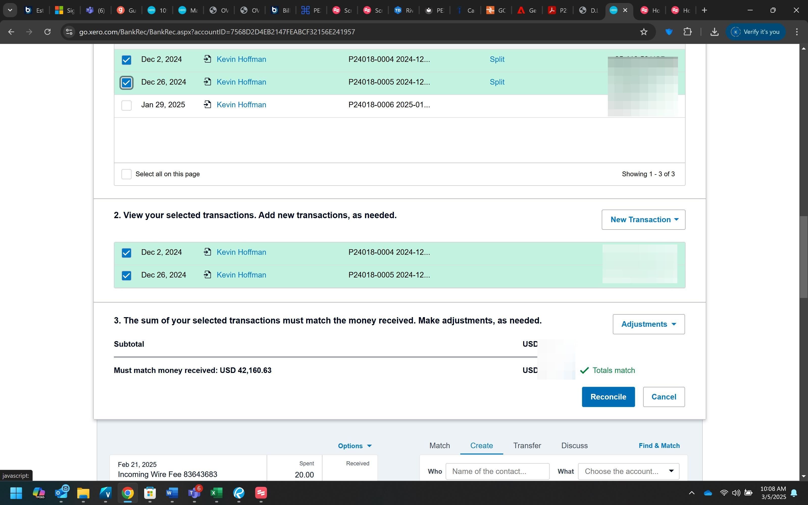 After selecting all appropriate invoices that match the deposit amount, click the "Reconcile" button to finalize the transaction.