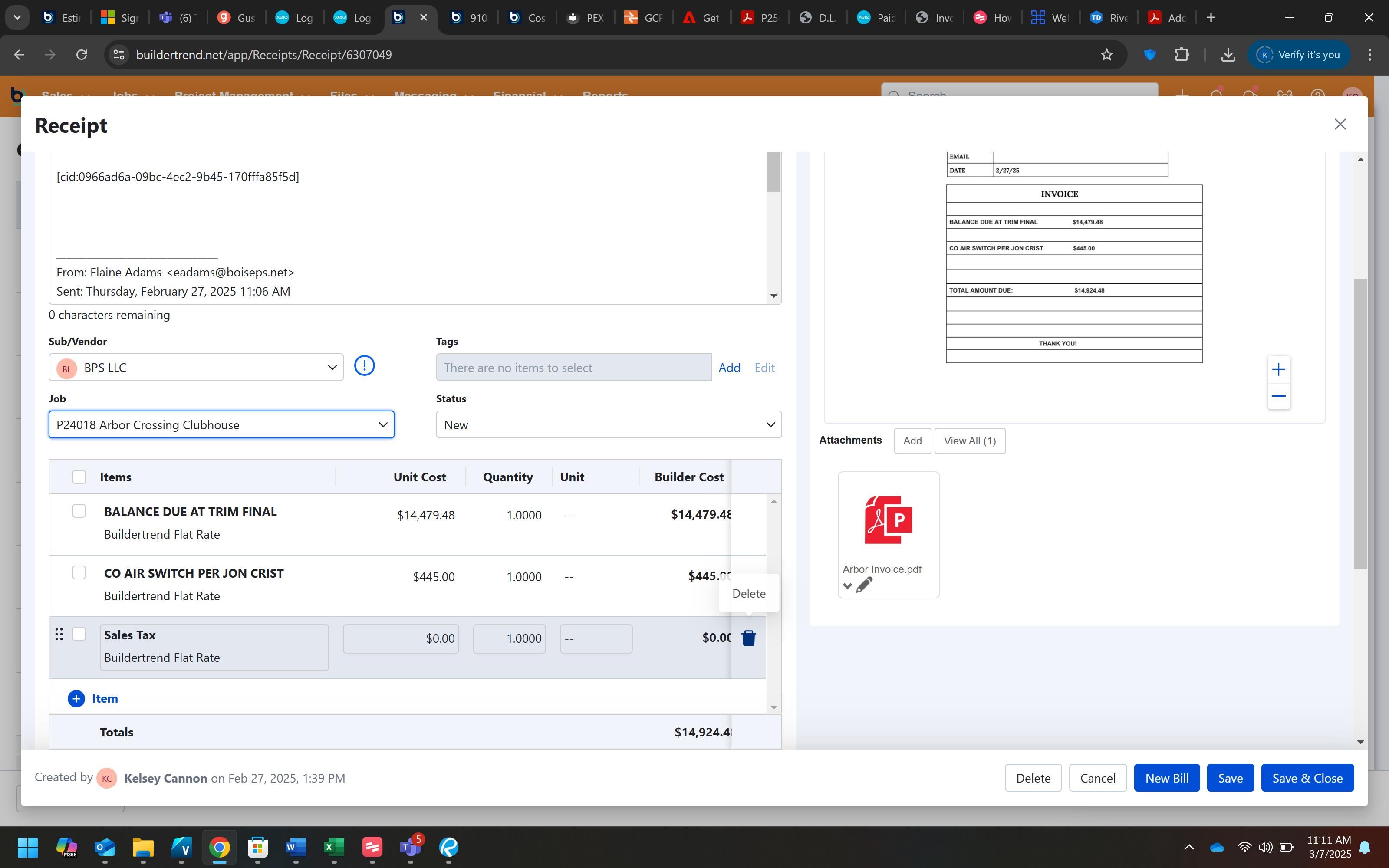 Buildertrend may automatically identify and match items from the invoice. Review these items for accuracy and delete any that are incorrect or unnecessary.